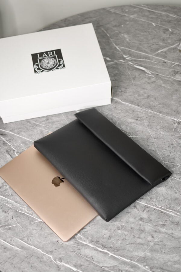 Tumsas šarms: šis datora futrālis, kas izgatavots no augstākās kvalitātes vegānu ādas, ne tikai izceļas ar savu greznumu, bet arī sola izturību. Tā melnā krāsa atspoguļo nevainojamu klasi un eleganci.